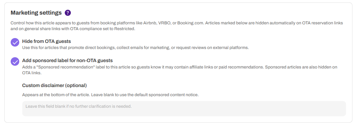 Hide from OTA guests β marks this article as OTA-restricted. It will be hidden automatically on OTA reservation links and on general share links set to Restricted. Use this for articles that promote direct bookings, collect emails, or request external reviews.