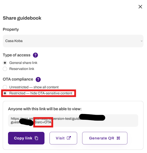 When generating a general or public share link, set OTA compliance to Restricted. This automatically adds a ?src=ota parameter to your link, telling SmoothStay to hide OTA-sensitive content when guests open the guide.