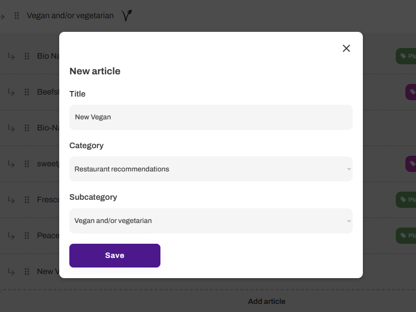Scroll to the bottom of the article list and click Add article. Enter a descriptive title for your article (e.g., name of restaurant or tip). Click Save to begin editing.