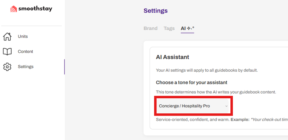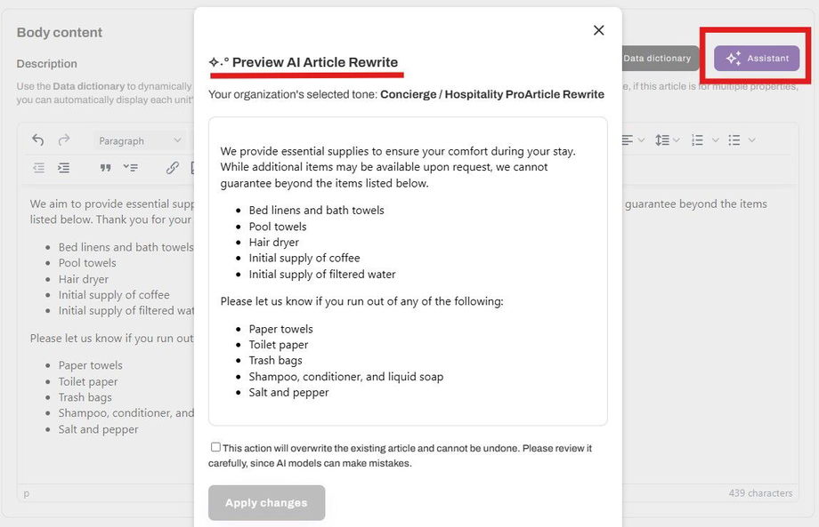 The AI Assistant rewrites your article description with improved clarity, tone, and structure — based on the voice you've selected in your account settings. It’s specifically trained for hospitality use cases to help you deliver confident, friendly, and guest-ready communication in seconds.