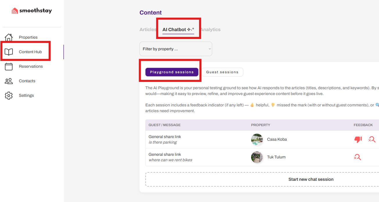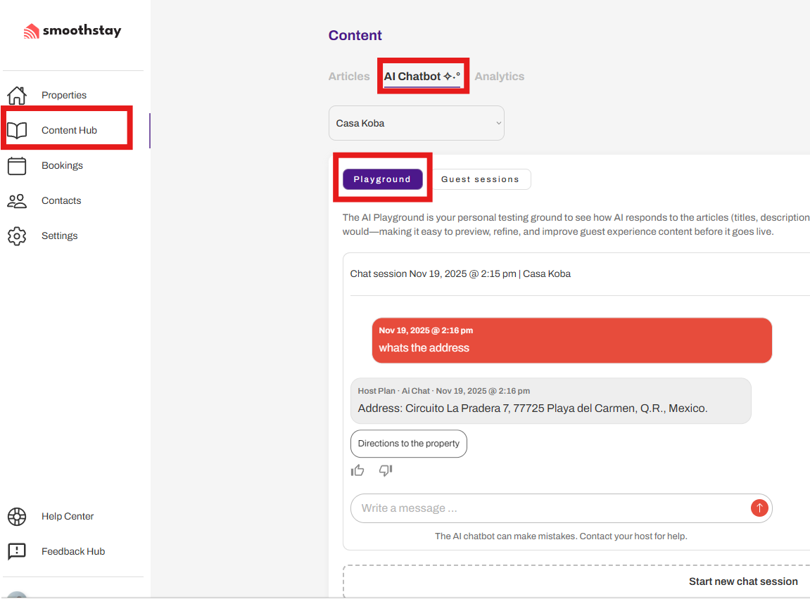 Before turning the chatbot on for guests for each property, you can safely test it in the AI Playground: