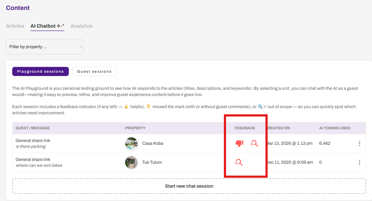 Guests can provide feedback for each message. Each session includes a feedback indicator (if any left) β π helpful, π missed the mark (with or without guest comments), or πβ out of scope β so you can quickly spot which articles need improvement.