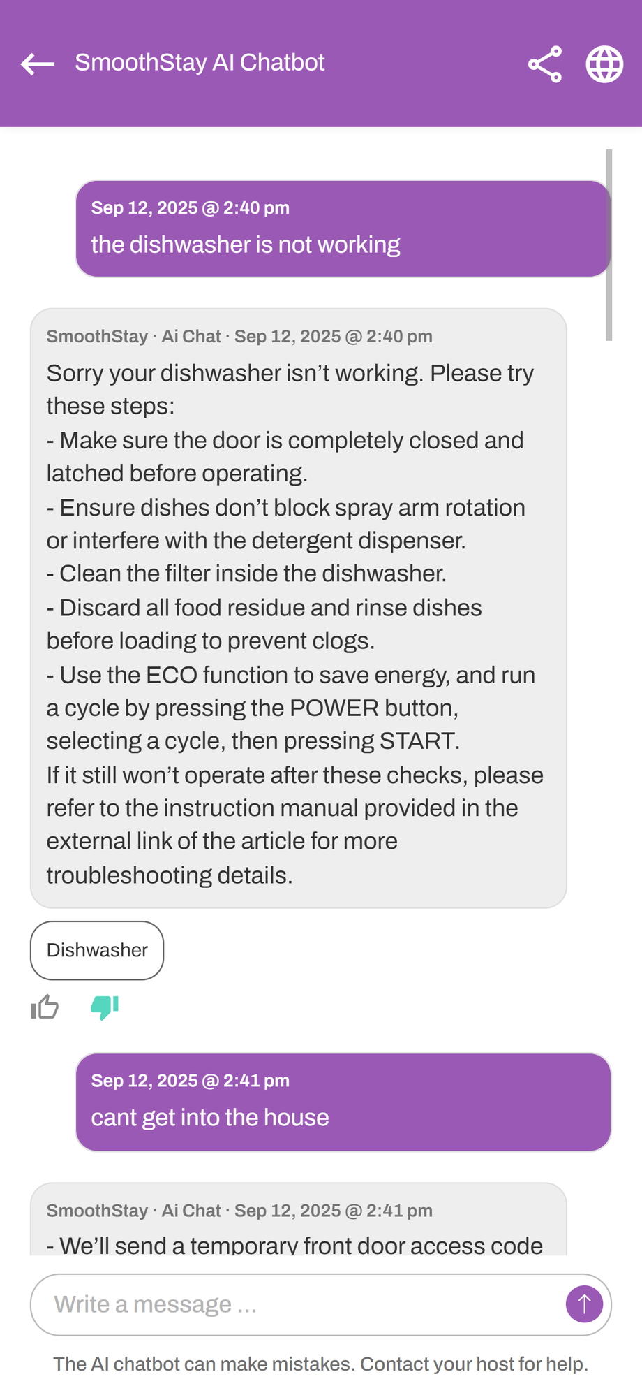The AI Chatbot allows guests to ask natural questions — like “What’s the Wi-Fi password?” or “The dishwasher isn’t working” — and receive answers based on the content in your guidebook.