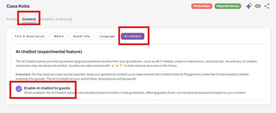 Go to Properties > Select a Property > Content > AI Chatbot tab inside your guidebook.