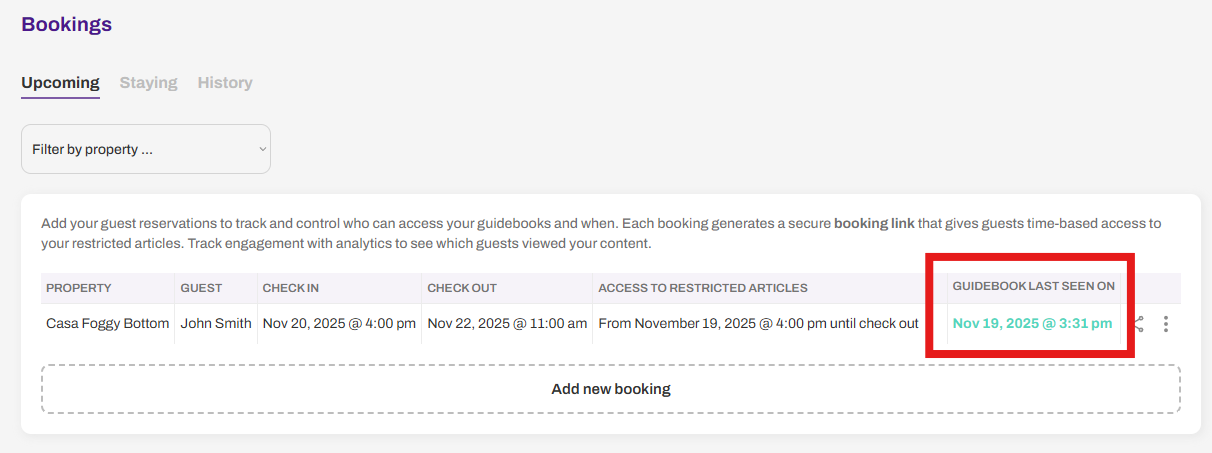 On the Bookings screen, you'll see a “Guidebook Last Seen On” column. This shows when each guest last accessed their booking link, helping you confirm they have all the information they need.