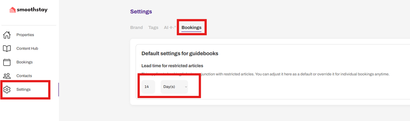 Default lead time is set in Settings → Bookings, but you can adjust it for each reservation—allowing flexibility for special cases (like early check-ins). After check-out, guests immediately lose access to restricted articles, protecting your property.