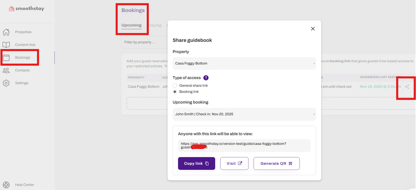 Booking links let you share your SmoothStay guidebook privately and securely with individual guests. Every booking link is unique and offers time-based access control, perfect for sharing sensitive details only when and with whom you want.