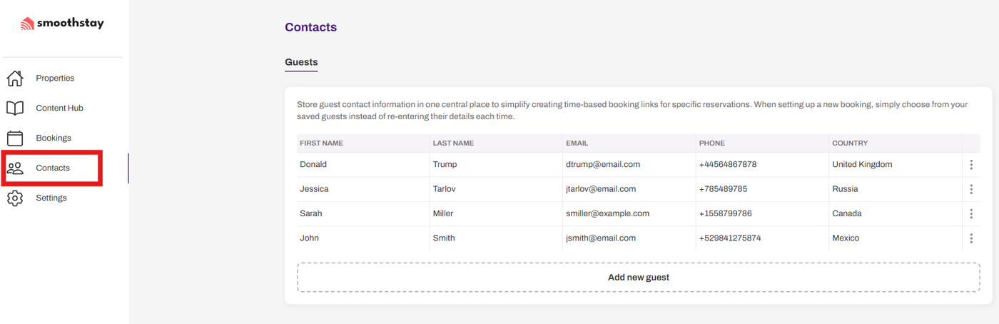 The Contacts section is a central place to store guest information for easy booking links management. Add your guests’ names, emails, phone numbers, and country once—then quickly select them when creating new booking links. This saves time, reduces errors, and helps you generate booking links for returning guests with just a click.