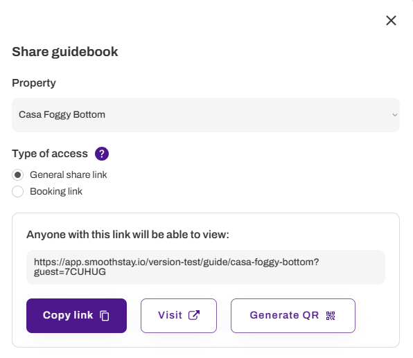Tip: You’re not limited to just one way of sharing—general share links, reservation links, and public links can all be used together or separately as needed. These access types are not mutually exclusive, so you can keep your guidebook public for general visitors, send reservation links with time-based restrictions to specific guests for sensitive information, and use general share links for quick sharing. Choose the right combination to fit your property’s needs and guest experience.